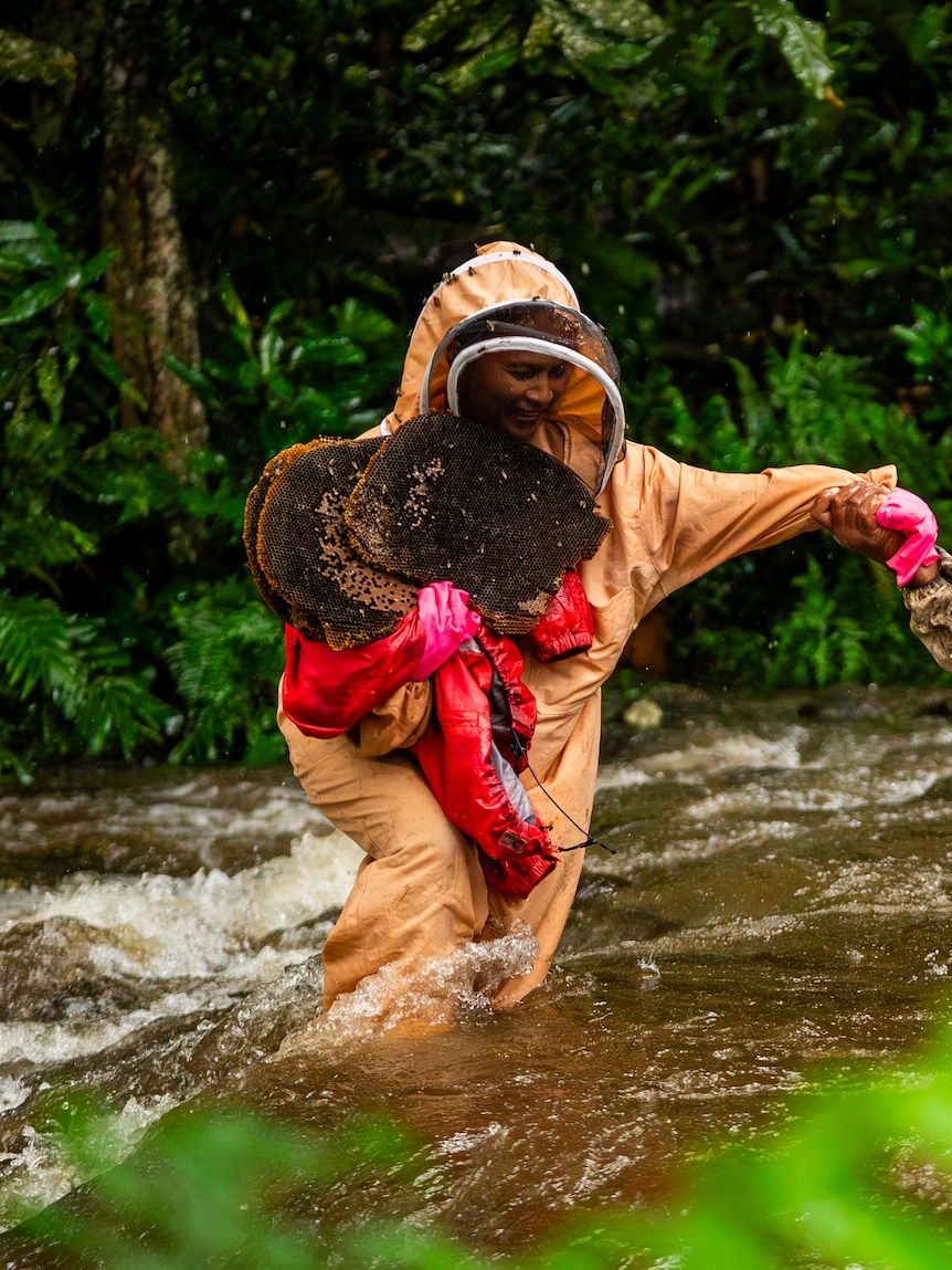 The former vegetable grower has gone to extraordinary lengths to build up her business, crossing raging rivers and scaling extreme heights to secure wild hives.