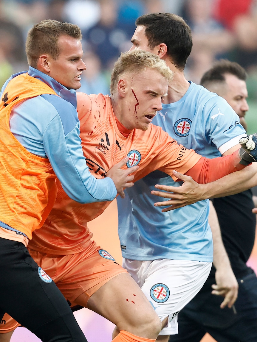 Fans from the Victory active area stormed the pitch and Melbourne City goalkeeper Tom Glover was struck with a metal bucket and injured.