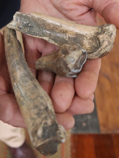 Found during council work at nearby Blackford Creek in 1954, two of the bones come from fossilised giant kangaroos – part of a pelvis and a big toe bone.