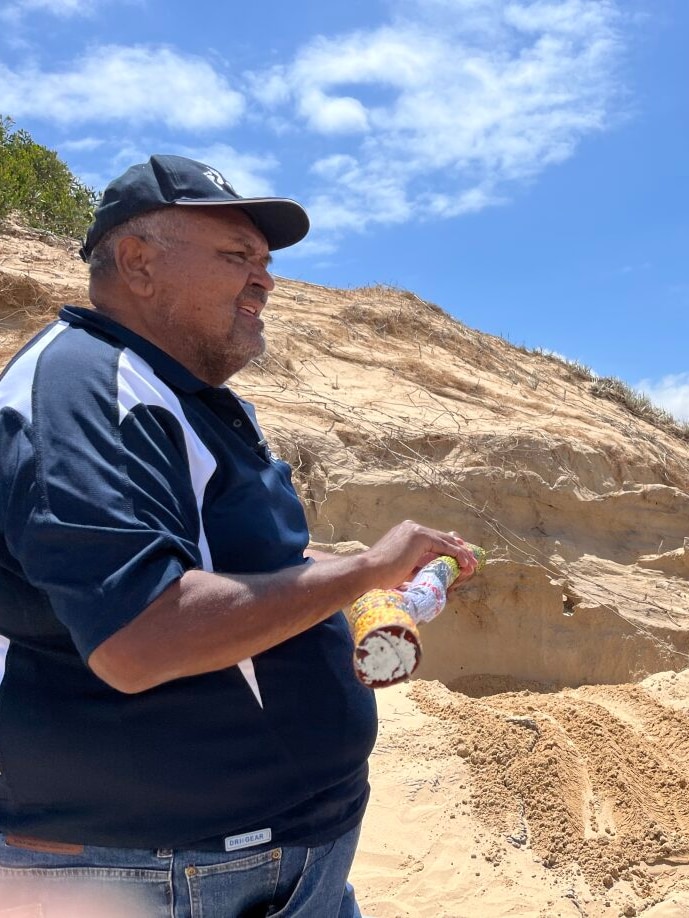 Joel Hirsch is the Spirit of the Coorong captain, and long time friend and colleague of Mark Koolmatrie, and was chosen to dig the hole where the remains were placed into.