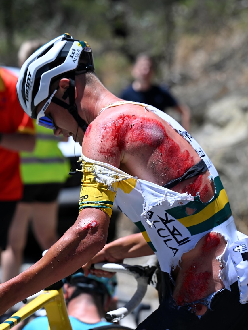 The three-time reigning Australian road champion suffered severe road rash, from the back of his left shoulder down to the hip, when he crashed near the end of stage three.