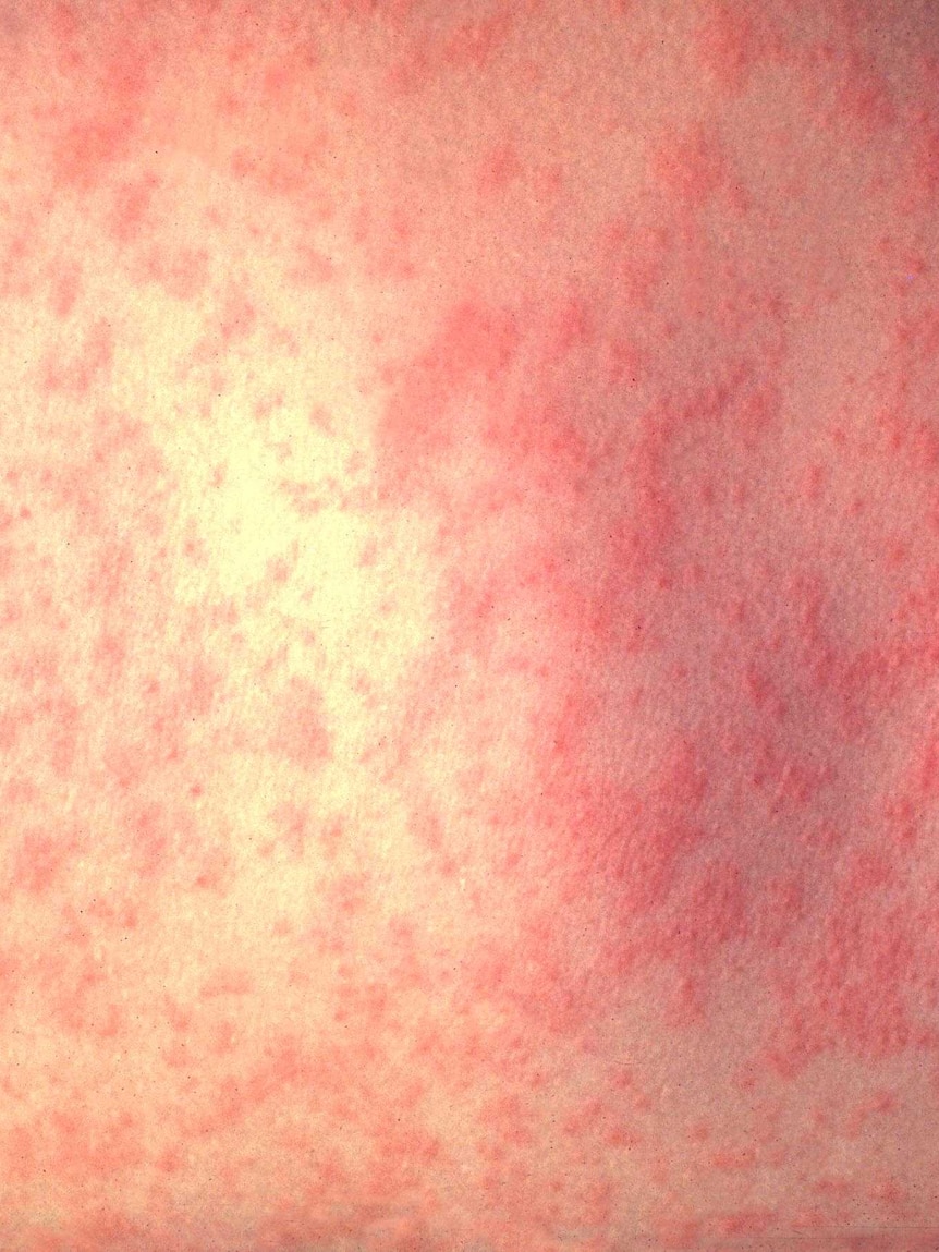 The highly contagious disease starts with fever, cough, runny nose, sore eyes, followed by a rash which starts on the head and spreads down the body.